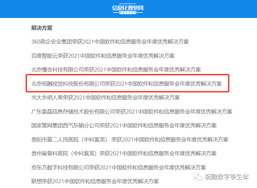 2022年1月18日,“2021第五屆中國(guó)軟件和信息服務(wù)業(yè)年度風(fēng)云榜” 評(píng)選結(jié)果正式發(fā)布,祝融科技憑借創(chuàng)新的研發(fā)能力、成熟的方案設(shè)計(jì)、良好的全周期服務(wù)成果入選“2021第五屆中國(guó)軟件和信息服務(wù)業(yè)年度優(yōu)秀解決方案”榜單。