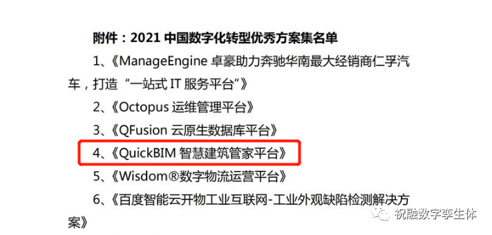 同時(shí),祝融科技QuickBIM智慧建筑管家平臺(tái)也作為行業(yè)數(shù)字化轉(zhuǎn)型典范,入選《2021中國(guó)數(shù)字化轉(zhuǎn)型優(yōu)秀方案集》。